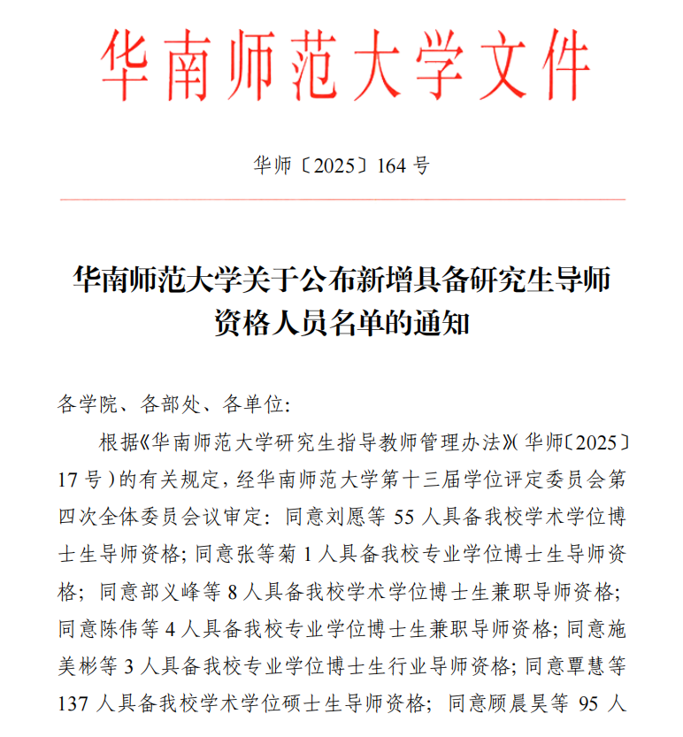 2025年12月13日,华南师范大学公布新增具备研究生导师资格人员名单,我系贾富强副教授通过该校学位评定委员会审定,取得教育专业学位硕士生兼职导师资格。