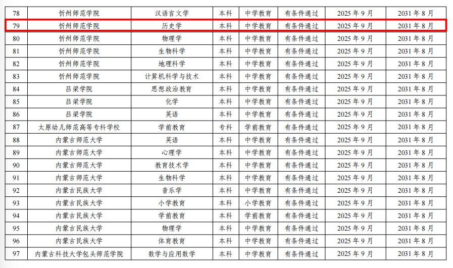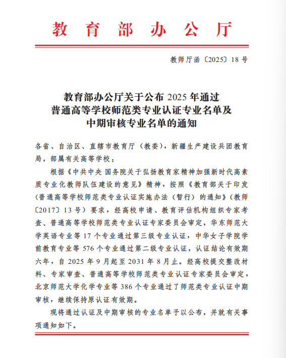 近日,教育部办公厅正式发布《教育部办公厅关于公布2025年通过普通高等学校师范类专业认证专业名单及中期审核专业名单的通知》(教师厅函〔2025〕18号)。我系历史学专业通过师范类专业认证第二级认证(有条件通过),认证有效期(有效期6年,自2025年9月起至2031年8月止)。
