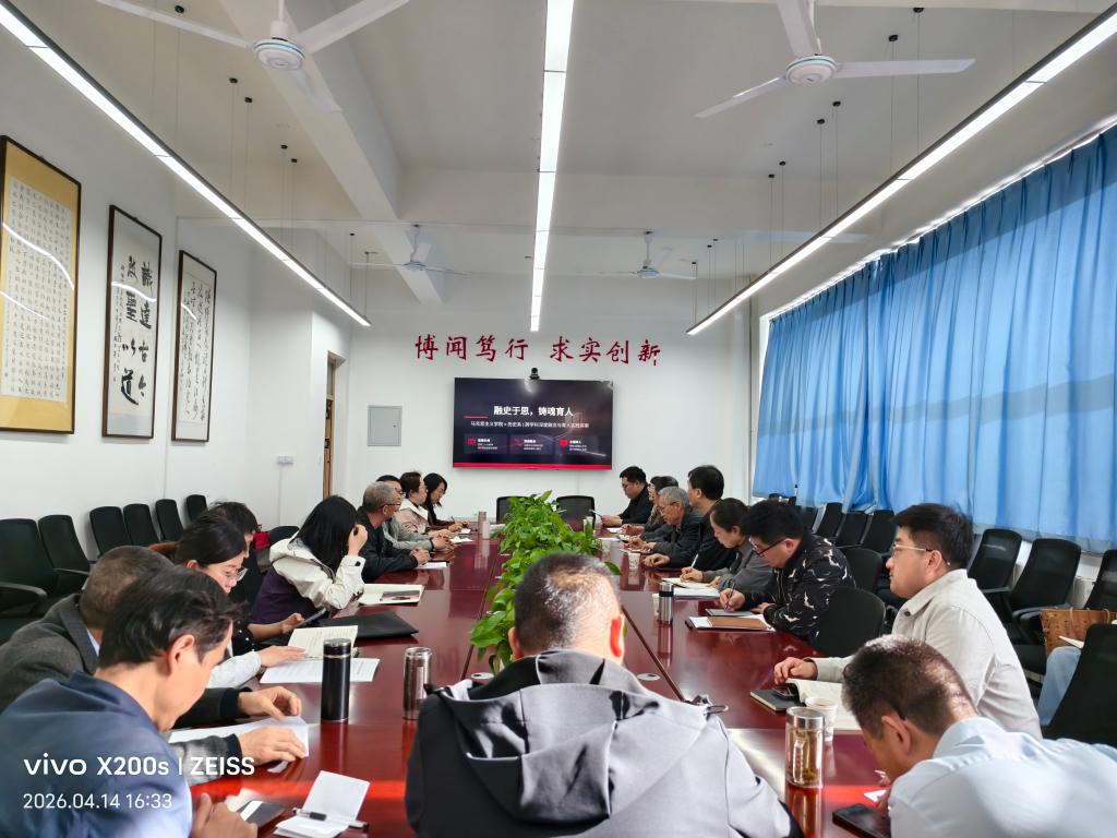 为深入贯彻落实党的二十届四中全会精神,全面落实学校2026年“教研活动月”工作部署,深化课程思政建设,推动思政教育与专业教学深度融合,4月14日,历史文化系与马克思主义学院在博闻楼323会议室联合举办“融史于思,铸魂育人”课程思政结对共建专题研讨会。教务部、教育教学质量评估中心、校教学督导组相关负责人出席会议,历史文化系主任、教学副主任、中国近现代史教研室全体教师及部分骨干教师,马克思主义学院院长、教学副院长、思想道德与法治教研室全体教师参加会议,会议由马克思主义学院赵逊老师主持。